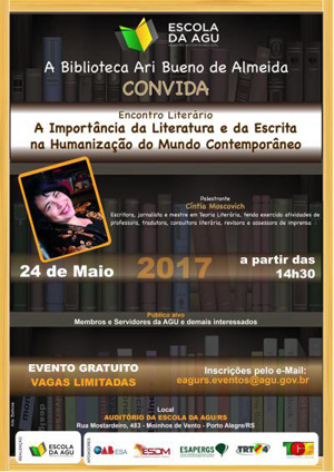 A Escola da AGU no Estado do Rio Grande do Sul informa que estão abertas as inscrições para o Encontro Literário - a importância da literatura e da escrita na humanização do mundo contemporâneo.