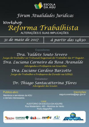 A Escola da AGU no Estado do Rio Grande do Sul informa que estão abertas as inscrições para o Fórum Atualidades Jurídicas - Workshop sobre Reforma Trabalhista - Alterações e suas implicações.