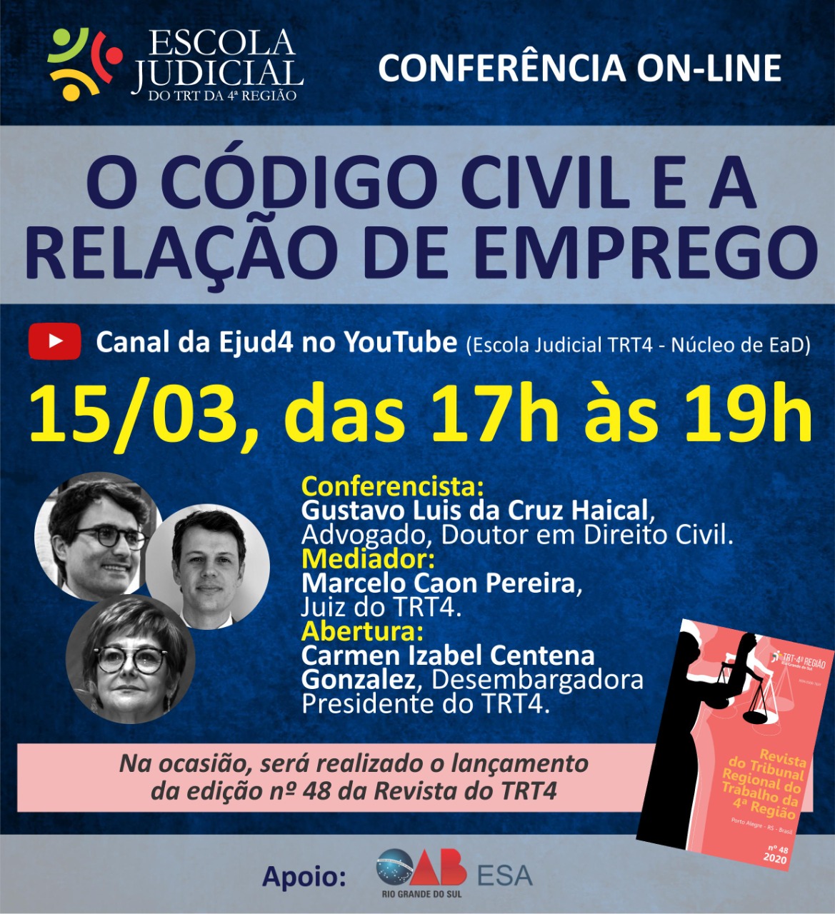 Na próxima segunda-feira (15/3), será lançada a edição 48 da Revista do Tribunal Regional do Trabalho da 4ª Região, por ocasião do evento “O Código Civil e a Relação de Emprego”, que ocorrerá das 17h às 19h, no Canal da Ejud4 noYouTubeAbre em nova aba