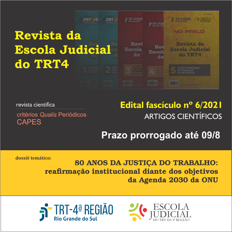 O fascículo 6 tem como dossiê temático 80 Anos da Justiça do Trabalho: reafirmação institucional diante dos objetivos da Agenda 2030 da ONU. Também serão recebidos artigos sobre outros assuntos que reflitam a linha editorial do periódico.