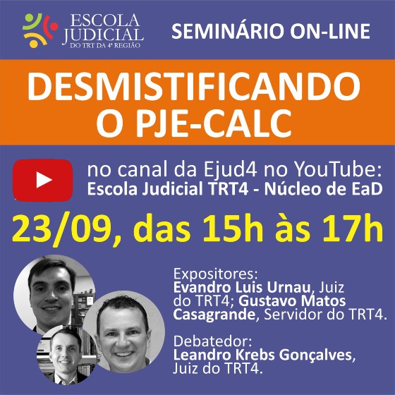 21.09.2020Evento da Ejud4: Seminário On-Line - Desmistificando o PJe-CALC (Transmissão On-Line) -