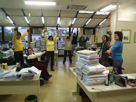 A ginástica foi ministrada pela professora de Educação Física Jussara Costa, funcionária do Sesi, apoiada pela também professora de Educação Física Fernanda Rodrigues, funcionária do CREF2/RS. No TRT, a organização ficou a cargo dos servidores Valmir Mello de Azambuja e Regina Vanzetto, da Seção de Freqüêncua e Férias da SRH.