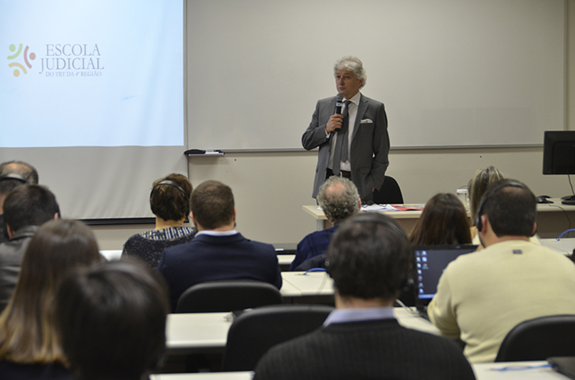 A Escola Judicial (EJud4) do Tribunal Regional do Trabalho da 4ª Região (RS) recebeu, na tarde da última quinta-feira (28/6), o jurista francês Dominique André Rousseau. O especialista abordou, no "Fim de Tarde da EJud4", o tema "Constitucionalismo e direitos sociais: o trabalho no Século XXI". Rousseau é diretor do Instituto de Ciências Jurídicas e Filosóficas da Sorbonne, professor titular de Direito Constitucional da instituição e membro eleito do Conselho Superior da Magistratura da França. A palestra foi prestigiada por magistrados e servidores da 4ª Região, além de procuradores, advogados, estudantes e demais interessados pelo tema.