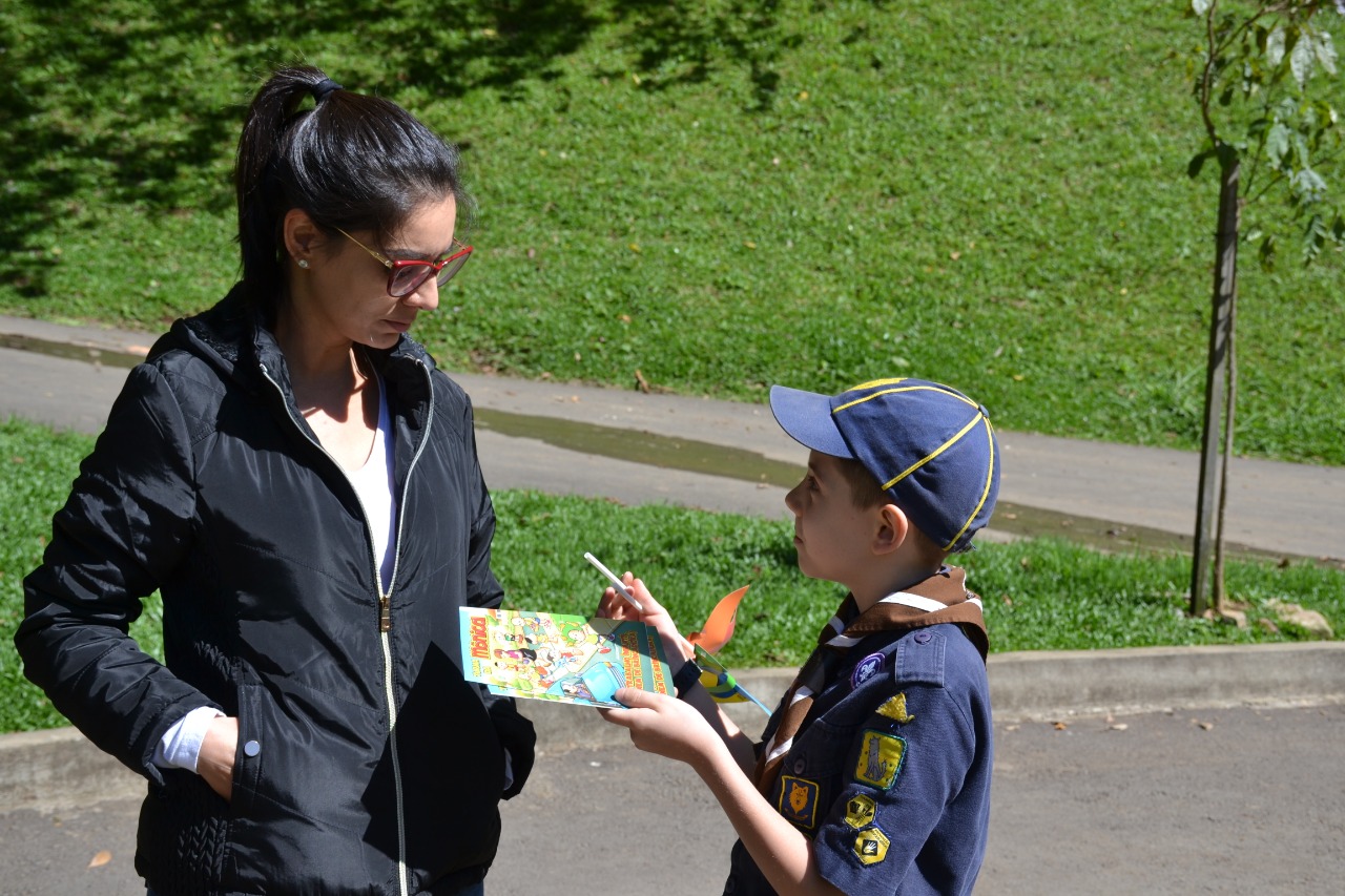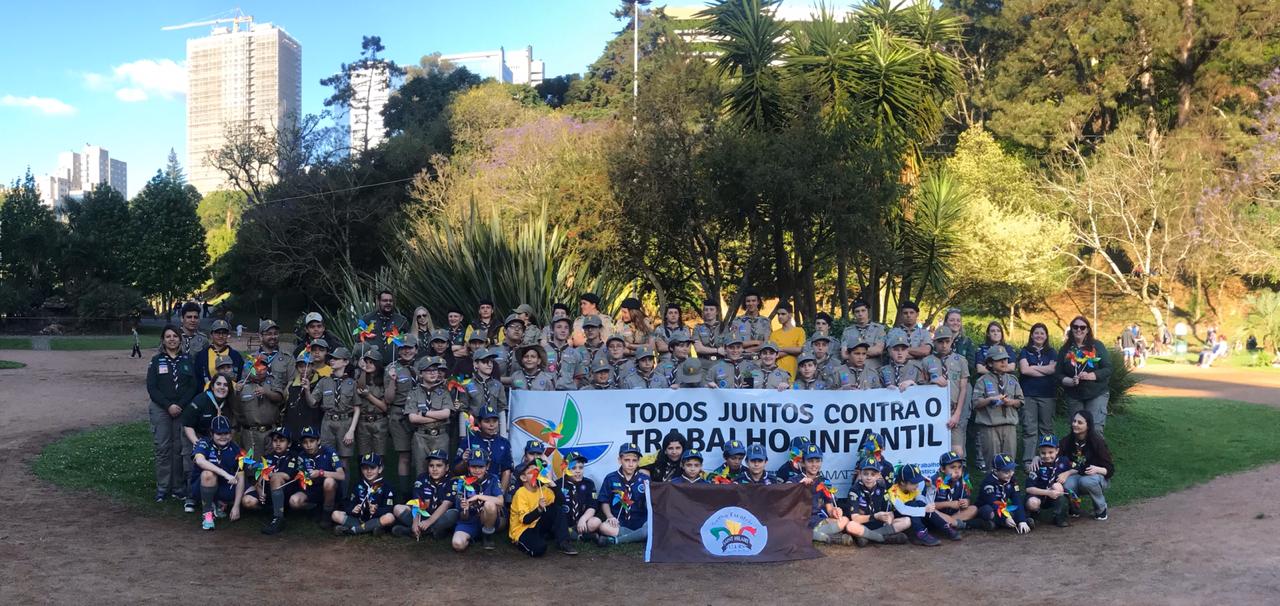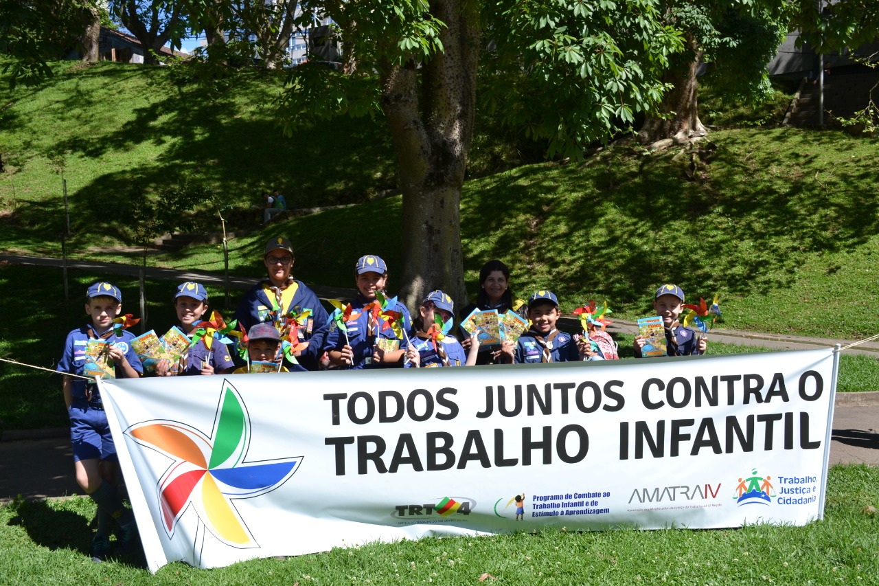 O Parque Getúlio Vargas, no centro de Caxias do Sul, foi palco de uma ação de conscientização sobre a importância do combate ao trabalho infantil no último sábado (19/10). Realizada pelo grupo escoteiro Saint Hilaire — do qual a servidora do TRT-RS Denise Bampi é presidente —, a ação integrou o calendário de atividades da Semana Municipal do Consumo Consciente do município.
