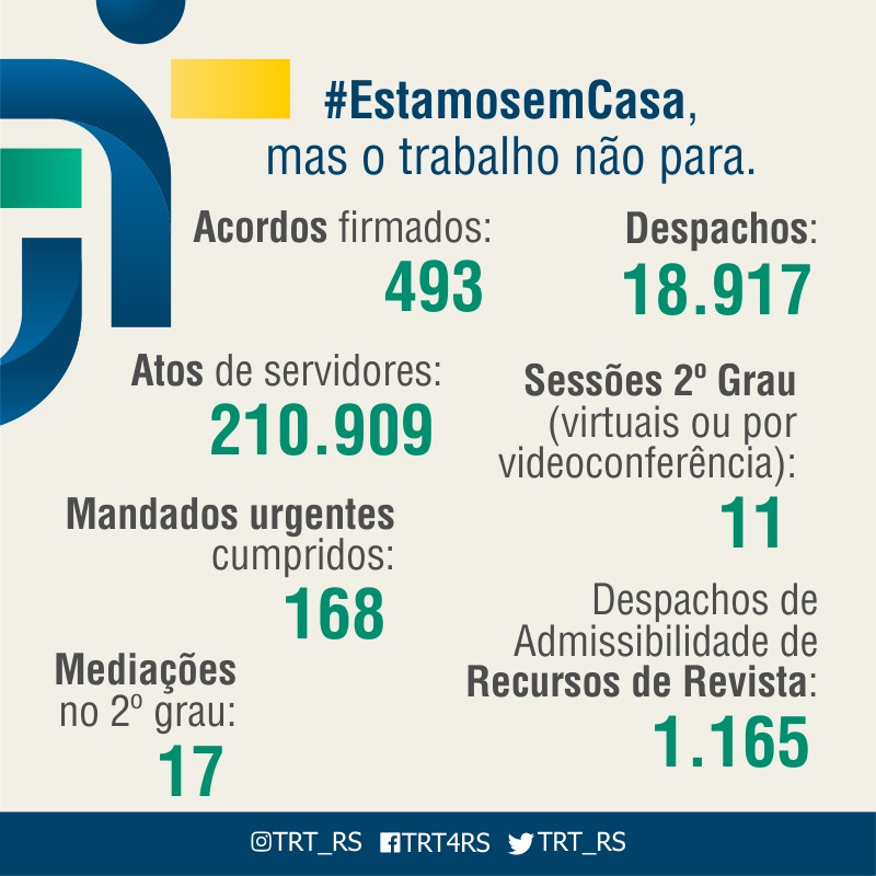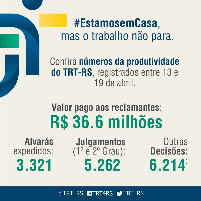 #EstamosEmCasa, mas o trabalho não para. Veja novos números da Justiça do Trabalho gaúcha, referentes à semana de 13 a 19 de abril.