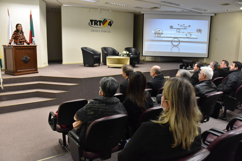 Nesta manhã (3/6), a ministra do Tribunal Superior do Trabalho (TST) Morgana de Almeida Richa discorreu sobre “A força normativa do precedente e a rescindibilidade da coisa julgada no Código de Processo Civil/2015”. A exposição foi seguida por uma mesa-redonda da qual participaram também o diretor da Escola Judicial do Tribunal Regional do Trabalho da 4ª Região, desembargador João Paulo Lucena, e o juiz Cesar Zucatti Pritsch, que atuou como mediador. O presidente do TRT-4, desembargador Francisco Rossal de Araújo, recebeu a palestrante e destacou a importância do evento, o primeiro após a plena retomada das atividades presenciais na instituição.