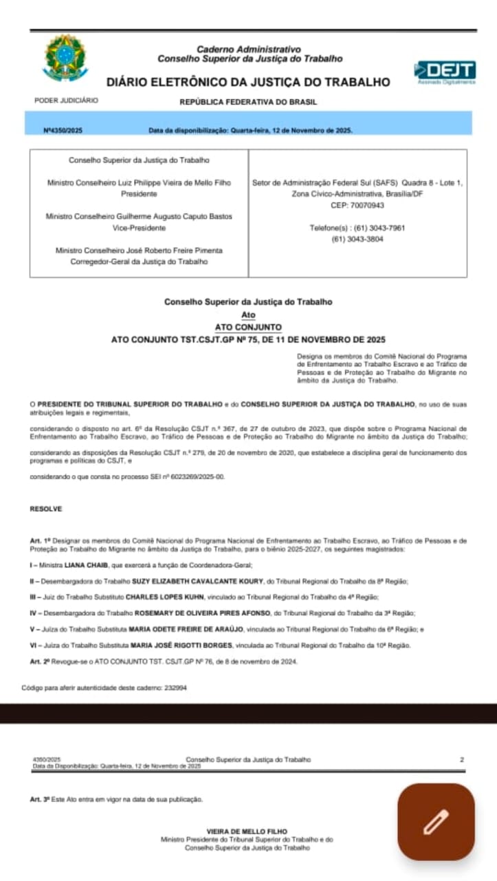 O juiz Charles Lopes Kuhn, do Tribunal Regional do Trabalho da 4ª Região (TRT-RS), foi designado para integrar o Comitê Nacional do Programa de Enfrentamento ao Trabalho Escravo, ao Tráfico de Pessoas e de Proteção ao Trabalho do Migrante para o biênio 2025-2027. A nomeação foi formalizada pelo Ato Conjunto TST.CSJT.GP nº 75/2025, publicado em 12 de novembro.