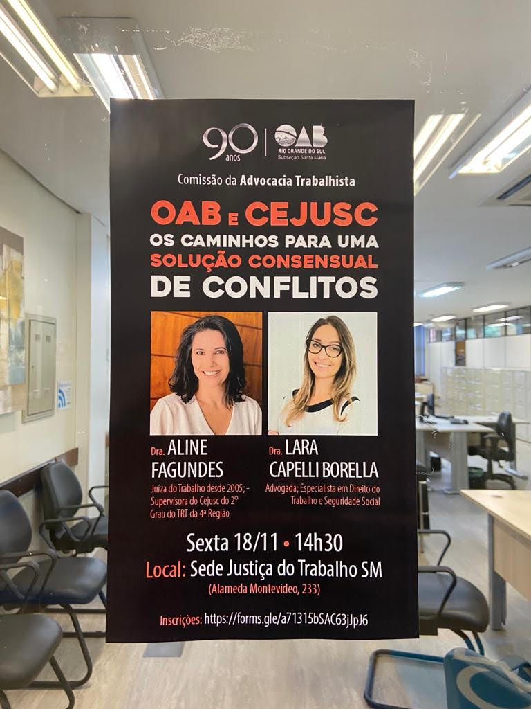 A Comissão da Advocacia Trabalhista da OAB-RS e o Centro Judiciário de Métodos Consensuais de Solução de Conflitos (Cejusc) de Santa Maria realizaram, na última sexta-feira (18/11), o evento "OAB e Cejusc: os caminhos para uma solução consensual de conflitos". Como palestrantes convidadas, estiveram presentes a coordenadora do Cejusc 2º Grau, juíza do Trabalho Aline Doral Stefani Fagundes, e a advogada Lara Capelli Borella. A iniciativa contou com exposição e debate sobre a mediação pré-processual e conciliação, bem como a respeito da relação do Judiciário Trabalhista com seus jurisdicionados na resolução consensual de conflitos.