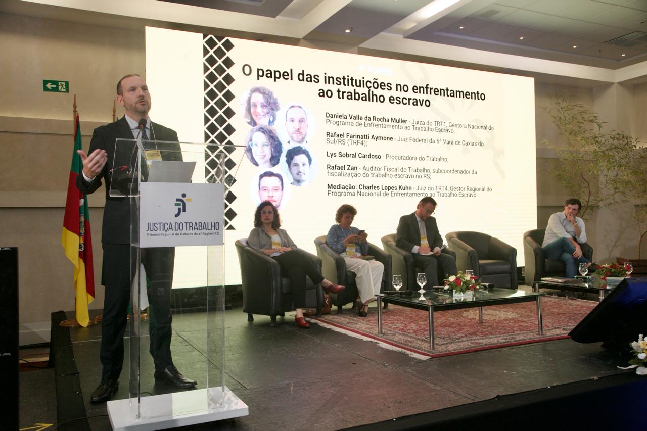 "O Papel das Instituições no Enfrentamento ao Trabalho Escravo". Esse foi o tema do quarto painel do seminário "Direito Fundamental ao Trabalho Decente: caminhos para a erradicação do trabalho escravo contemporâneo". A atividade ocorreu na manhã da última quarta-feira (28) e teve como painelistas a juíza do Tribunal Regional do Trabalho da 1ª Região (RJ) e gestora nacional do Programa de Enfrentamento ao Trabalho Escravo, Daniela Rocha Müller, o juiz Federal da 5ª Vara Criminal de Caxias do Sul, Rafael Farinatti Aymone, a procuradora do Trabalho Lys Sobral e o auditor-fiscal do Trabalho Rafael Zan. A mediação ficou a cargo do juiz do TRT-4 Charles Lopes Kuhn. Confira outras informações sobre o evento no hotsite.