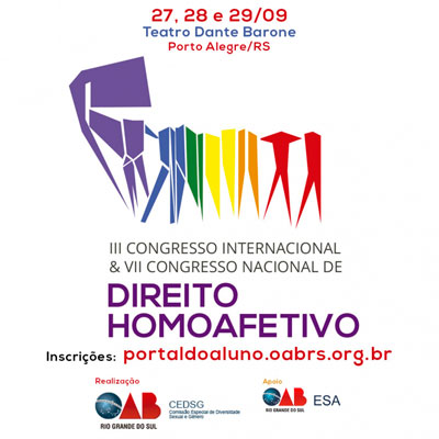 Entre os dias 27 e 29 de setembro, a Ordem dos Advogados do Brasil - Seccional do Rio Grande do Sul - realiza o III Congresso Internacional e VII Nacional de Direito Homoafetivo, no Teatro Dante Barone, na Assembleia Legislativa do Estado do Rio Grande do Sul (Praça Marechal Deodoro, nº 101 - Porto Alegre/RS).As inscrições são gratuitas e podem ser feitas através desteAbre em nova aba link.