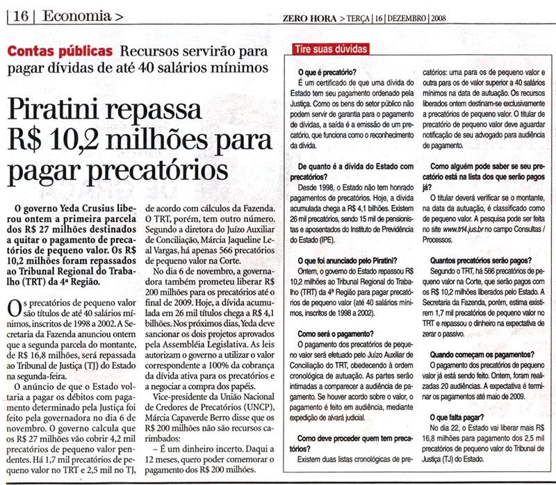 16.12.2008Zero Hora: Piratini repassa R$ 10,2 milhões para pagar precatórios -