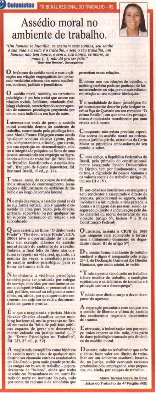 08.09.2008O Sul: Assédio moral no ambiente de trabalho 08.09.2008O Sul: Assédio moral no ambiente de trabalho